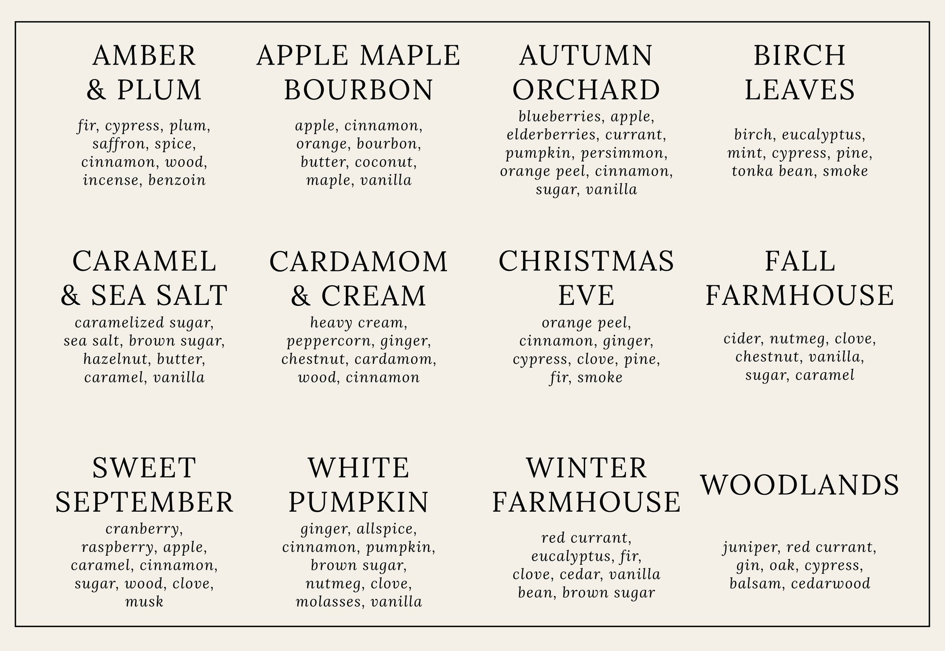 Includes all 12 Fall & Winter samples in one box with a handy reference card for easy sampling. Each melt is .3 ounces.